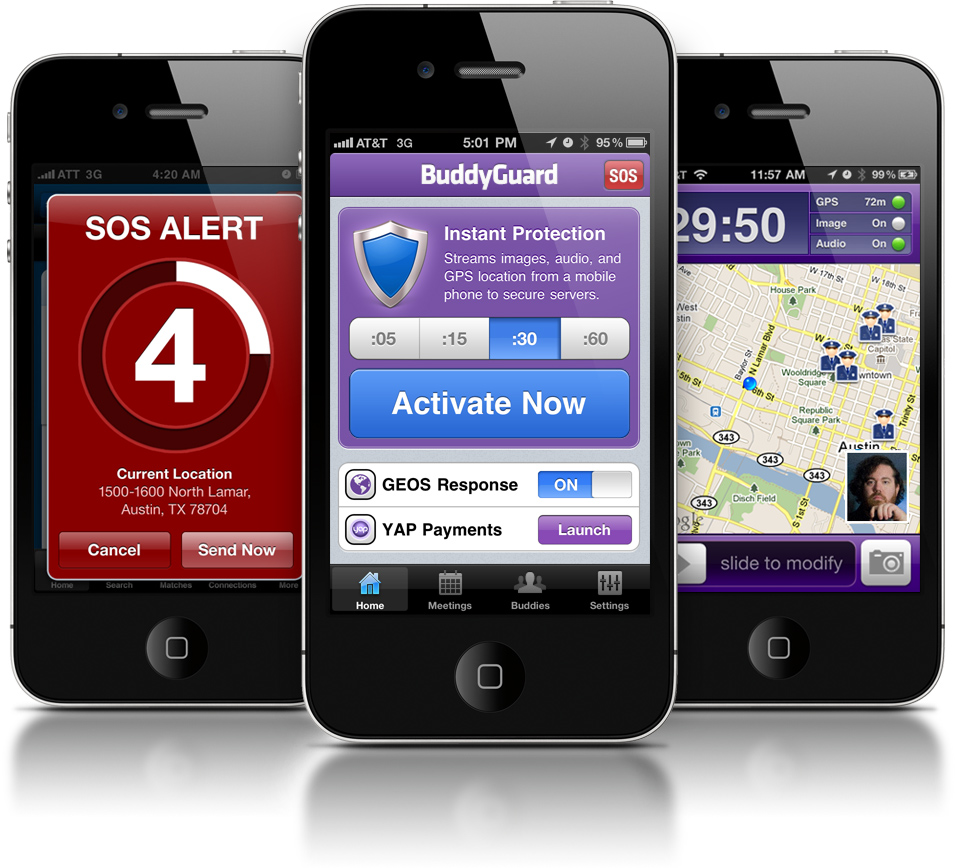 BuddyGuard is a next-generation safety application for smartphones. Like a human buddy system, BuddyGuard can be used in a variety of situations when a person’s safety confidence is low, such as domestic disputes, meeting strangers, online dating, exchanging goods and commerce, traveling abroad, medical aliments, walking alone at night, after a motor accident, and more. BuddyGuard works globally where cellular data or WiFi is available, and has been field tested by FOX News during the Libya civil war.